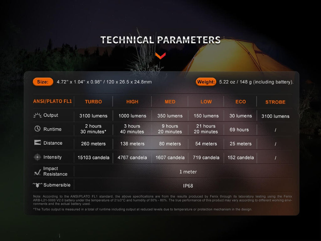 Unleash your sense of adventure with the Fenix E35R high-performance rechargeable LED flashlight, boasting an impressive 3100 lumens and a wide beam. Its Intelligent Overheat Protection (IOP) provides reliable heat resistance, while its sleek design and side switch access to 6 illuminating modes with double-click lock/unlock. Power up with the Fenix ARB-L21-5000 V2.0 battery for up to 69 hours of illumination on Eco mode. Experience the ultimate EDC flashlight with the E35R today!