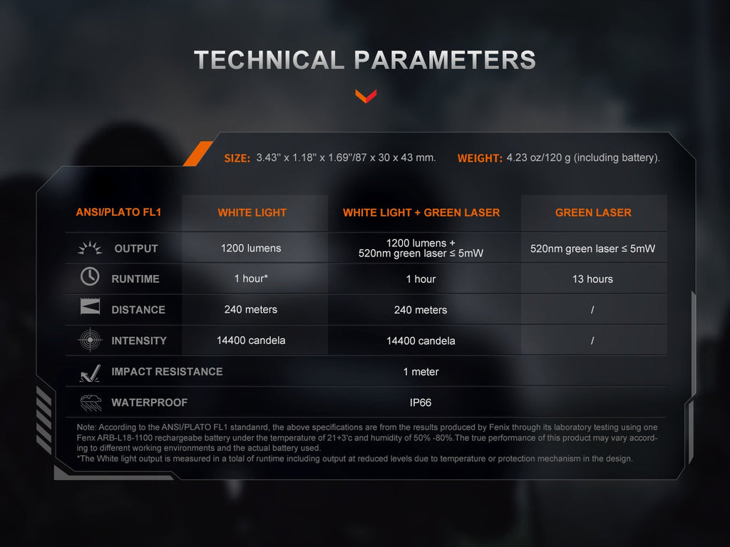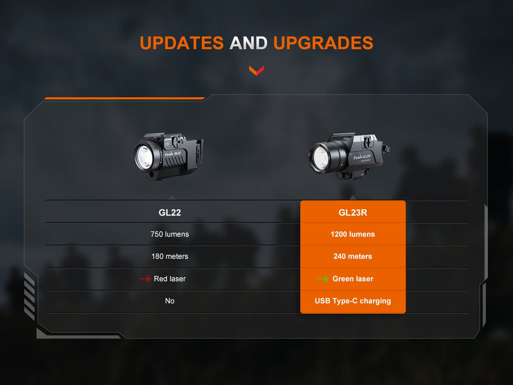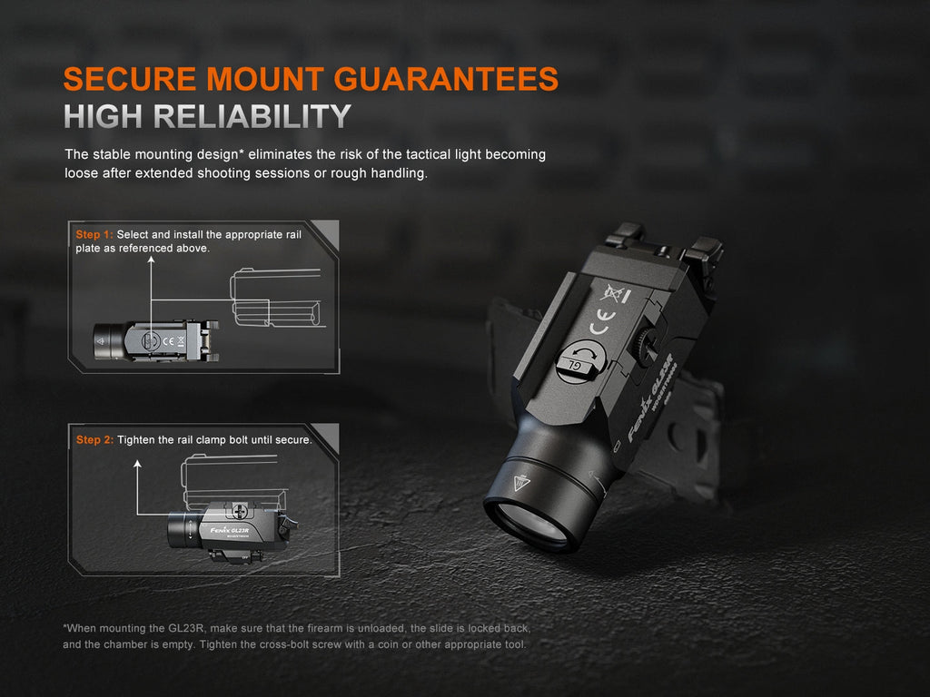 The Fenix GL23R is a powerful, compact pistol-mounted tactical light designed for optimal performance in any situation. With a 1200-lumen maximum output and a precise 520 nanometer green laser, this light ensures superior visibility and accuracy. The GL23R features modular, customizable switches with ambidextrous power and output selection, allowing seamless operation for both left- and right-handed users. Its compact and lightweight body, measuring under 4 inches and weighing just over 4 ounces, makes it an ideal fit for any firearm. Capable of illuminating targets up to 240 meters away, the GL23R also boasts a minimal laser offset of less than .8 mm for precision shooting. Built to endure, it withstands a 10,000-cycle shock test and over 5,000 rounds of simulated live fire while maintaining a 2MOA accuracy. The USB-C rechargeable light includes a Glock mounting plate and a 1913 Picatinny rail plate, ensuring compatibility with a wide range of firearms. With an impressive 13-hour green laser runtime and IP66-rated waterproofing, the GL23R is engineered to perform in even the toughest conditions.