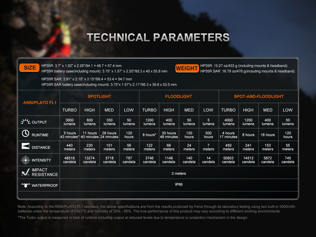 This headlamp comes in two different versions, the standard HP35R and the HP35R SAR. The headlamp output and functions are the same, but the SAR version is slightly larger and includes a flame-retardant rubber headband and features an NVG shroud-compatible helmet mount. The standard version is also helmet-mountable using the ALG-04 helmet bracket or ALG-03 helmet bracket (each sold separately).