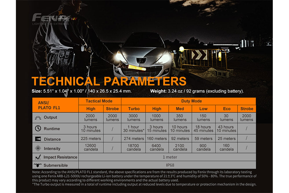 At just 5.5 inches and pocket-clip enabled, the Fenix PD36 TAC flashlight offers amazing power and performance in a portable package. Impressive 3000 lumens of light and 898 feet of beam distance powered by a single Fenix ARB-L21-5000U USB Type-C rechargeable battery let you take on the night. Fast recharge in 4 hours and with a maximum run time of 160 hours on eco mode, this light is engineered for the long haul. Constructed from impact-resistant A6061-T6 aluminum alloy with double springs for battery protection, this EDC and tactical powerhouse stands up to any task. Expedite your mission with a tactical switch, mechanical toggle switch and two user-friendly operation modes. Get the dependable, dynamic lighting you need - go with the Fenix PD36 TAC flashlight.